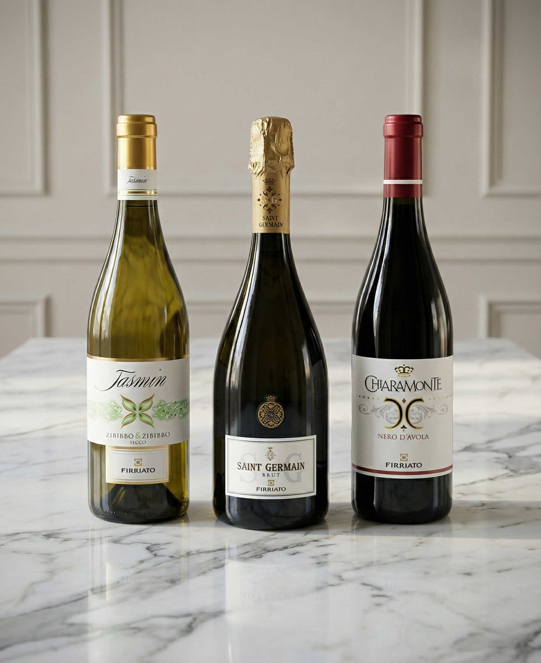 This Sicilian trio showcases the island’s diversity and sunshine. Saint Germain sparkling opens with crisp citrus and fine bubbles. Jasmin Zibibbo adds floral aromatics and refreshing energy, while Chiaramonte Nero d’Avola brings bold, warm southern character.